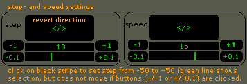 use this section to set up the step and speed. set speed to +10 (or so) to see what happens. for accurate setting of the speed, you can use the "+1" and "-1" and "+0.1" and "-0.1" buttons. for a more rough setting, just click somewhere on the black stripe to get a speed setting from -50 to +50. the big button is for fast direction-switch. what exactly the number means, depends on the movie itself and its framerate (fps). try out yourself wit your source files and you will see.