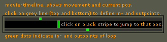 The green bar in the middle shows the current position relative to the full movie. as the movie continues, so does the bar. you can jump to any position of the movie if you click on the black stripe in the middle, and you can set loop-in and loop-out points with clicking on the grey stripes at the top and the bottom.