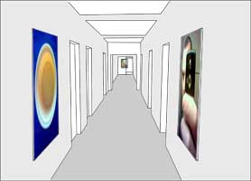 Dabei werden die zwei, vom Internetvoting ausgewählten Bilder im Flur so aufgehängt, daß ein Zurücktreten und das von weitem Betrachten nicht möglich ist. Dadurch wird die Identifikation eines Bildes durch seine Pixel für den Rezipienten verdeutlicht. Das dritte Bild hingegen sollte so hängen, daß eine Betrachtung schon von weit entfernt (den ganzen Flur entlang) möglich sein wird. Hier wird die Auseinandersetzung mit dem Verhältnis von Betrachtungsabstand zu Bildinhalt und -qualität zur zentralen Aussage.